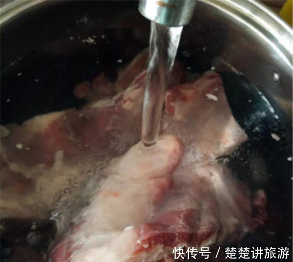 第2招:盐水多次浸泡盐水有一定的除血水的能力,羊肉被流水洗过以后,还会残留少量的血水,我们用淡盐水浸泡,每次浸泡10分钟,换3次水,血水基本就彻底除净了,羊肉浸泡过以后冲一遍凉水,就可以焯水去膻味了。